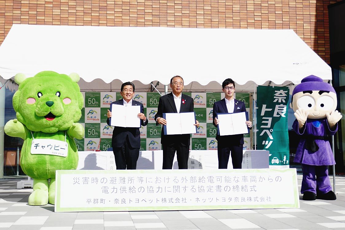 【奈良】NPグループの奈良トヨペット(菊池武之祐社長)とネッツトヨタ奈良(山田喜生社長)は、災害時の避難所などで給電可能な車両からの電力供給に協力する協定書を、平群町および香芝市と結んだ。 災害時などで電力不足が生じた際は、協定書に基づき...
