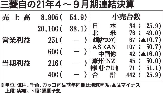 4~9月期の売上高は前年同期比54.9%増の8905億6700万円、営業利益は251億8600万円(前年同期は826億2600万円の損失)で、上期として2年ぶりの黒字に転換した。構造改革の効果のほか、新型「アウトランダー」が9月に米国の月次販売台数で過去最高を記録するなど好調だった。