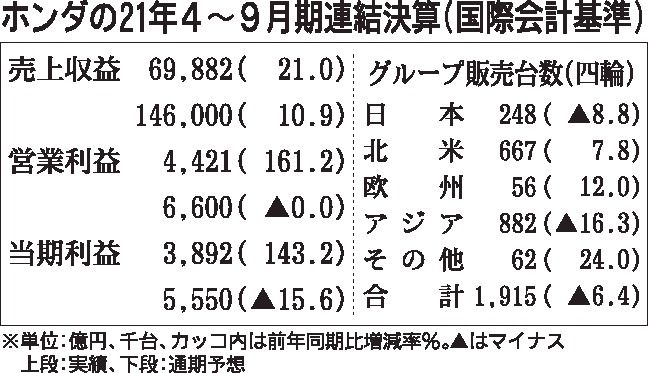 21年4~9月期連結業績は、営業利益が円安による為替差益などがあり、前年同期比2.6倍の増益となった。四輪車世界販売は、半導体不足による減産影響で同6.4%減の191万5千台に落ち込んだ。