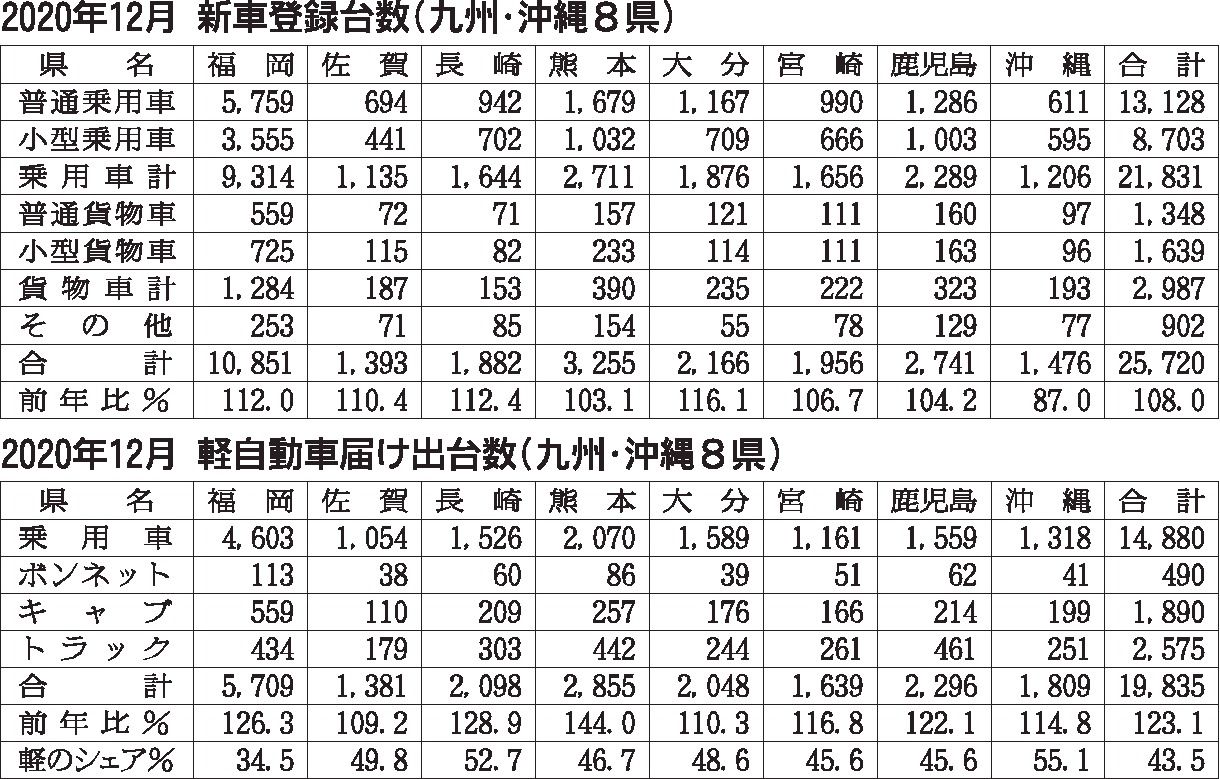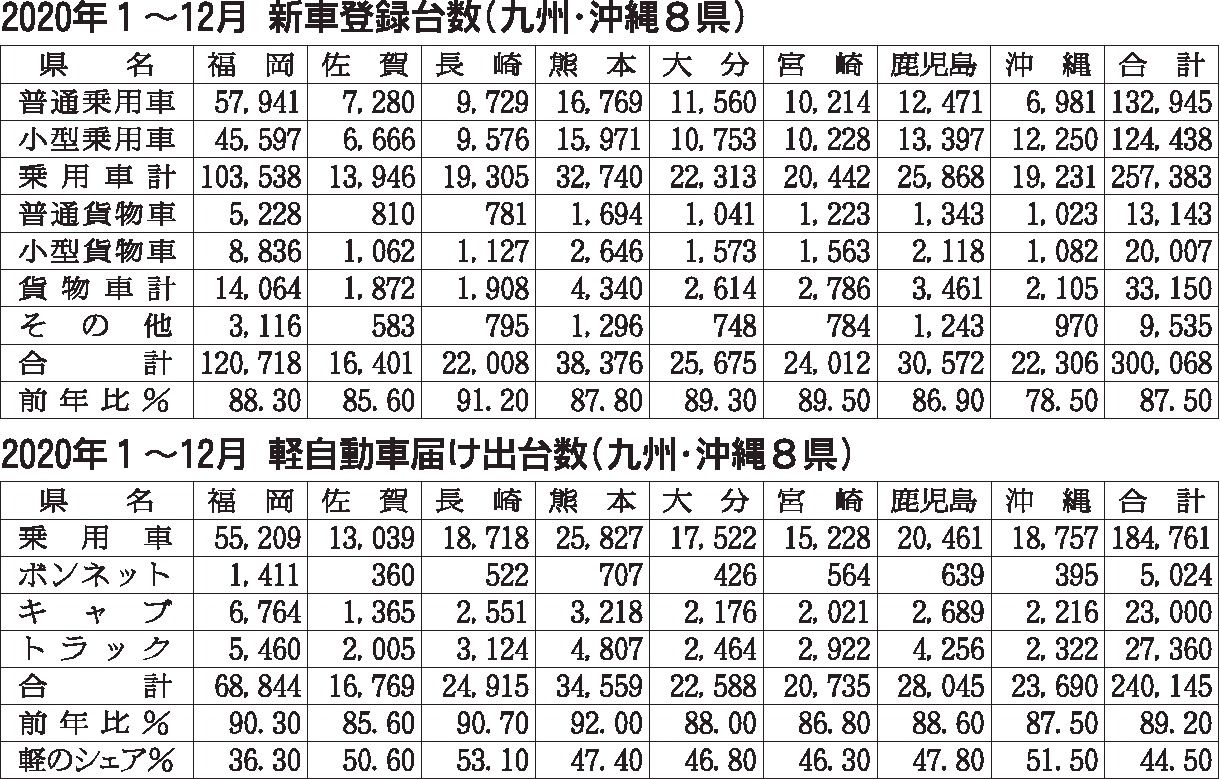 九州・沖縄地区の2020年(1~12月)の新車販売台数は前年比11・7%減の54万213台となり、2年連続で減少した。コロナ禍を受けて、燃費不正問題などで市場が低迷した16年(56万7692台)以来、4年ぶりに60万台を割り込んだ。10月...