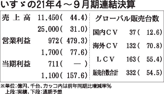 世界販売はLCV(ピックアップトラックおよび派生車)が前年同期比55%増の16万3千台、CV(商用車)も同54%増の16万9千台となり、コロナ禍以前の19年4~9月期を上回る水準となった。一方、新型コロナウイルス感染拡大による部品調達難による減産影響が小型トラック「エルフ」で表面化し、国内CVは前年同期並みの3万3千台にとどまった。