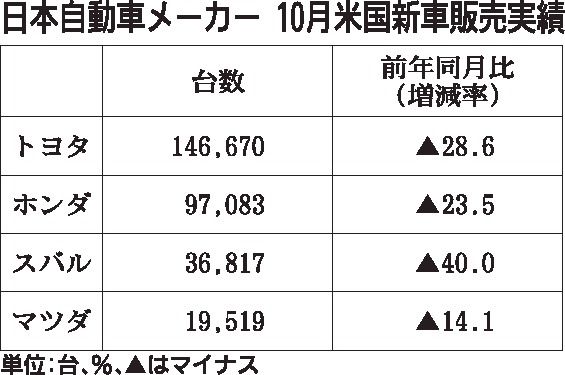 日本の自動車メーカー4社の10月の米国新車販売台数は、3カ月連続のマイナスとなる前年同月比27・9%減の30万89台だった。半導体や部品不足の影響で稼働率が低迷し、在庫がひっ迫したことで販売台数が落ち込んだ。減少幅は同23・0%減だった9...