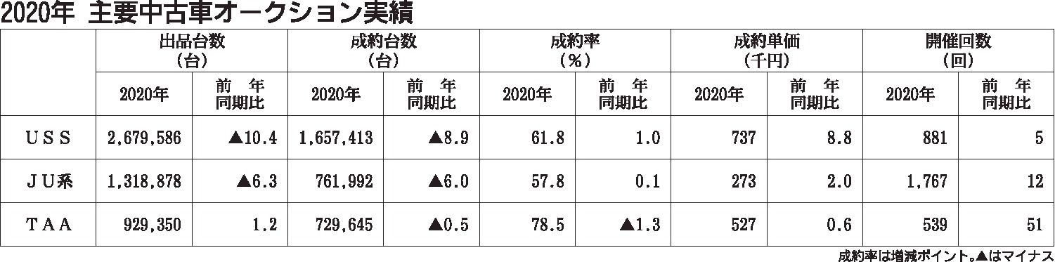 2020年(1~12月)の主要中古車オークション(AA)実績が出そろった。中古車市場の縮小にコロナ禍が追い討ちをかける形で業界最大手のユー・エス・エスや日本自動車商工組合連合会(JU中商連、海津博理事長)傘下のAA会場が出品車両の集荷に苦...