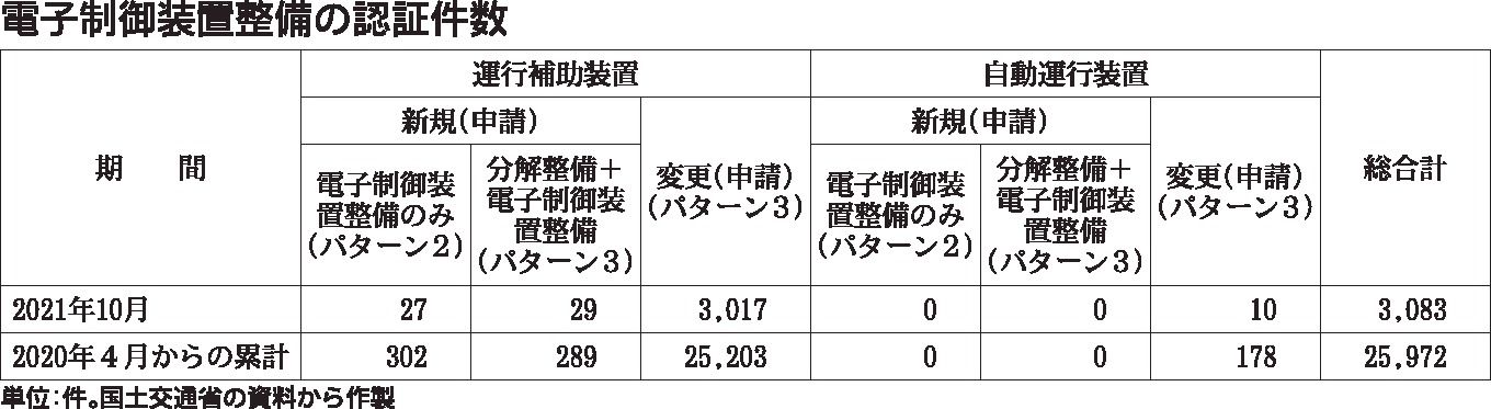 国土交通省がまとめた10月の電子制御装置整備の認証件数は、3083件だった。3千件超えは3カ月連続となる。内訳は運行補助装置が3073件、自動運行装置が10件だった。 地方運輸局別の認証件数は中部が732件、関東が435件、東北が424件...