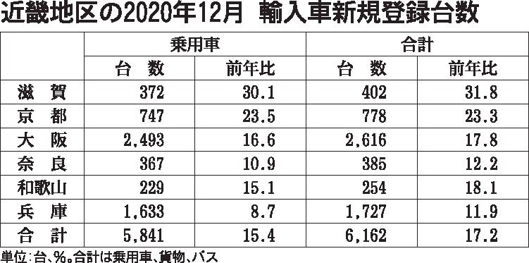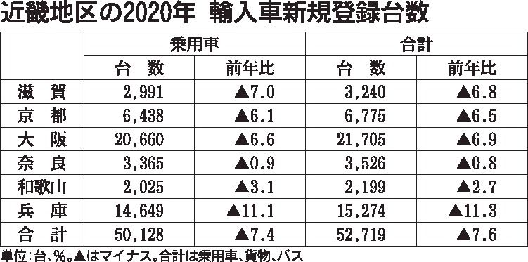 日本自動車輸入組合(JAIA)の発表によると、2020年(1~12月)の近畿地区の輸入車新規登録台数(外国メーカー車と日本メーカー車)は前年比7・6%減の5万2719台で、2年連続のマイナスだった。コロナ禍の影響でディーラーの営業活動が制...