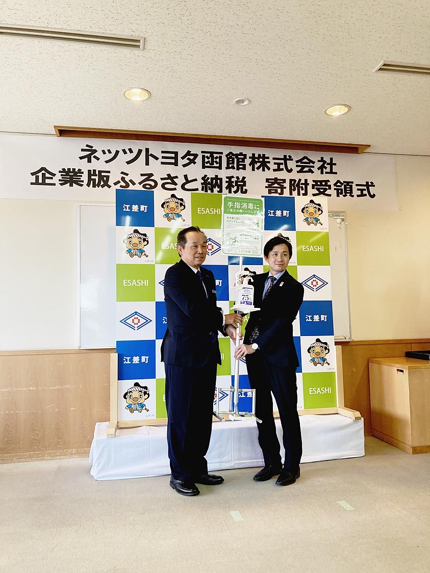 【函館】ネッツトヨタ函館(高木和良社長)は、江差町へ企業版ふるさと納税として10万円を寄付した=写真。またトヨタ製足踏み式消毒スタンド3台を贈呈した。 江差町(照井誉之介町長)役場で寄附式を実施。席上、高木社長は「江差町に店舗を構えて45...
