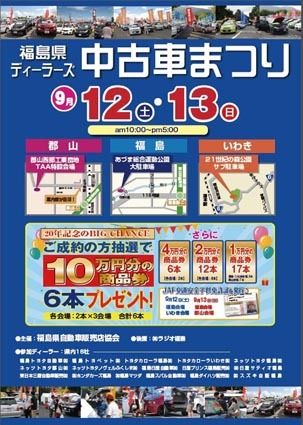 【福島】福島県自動車販売店協会(佐藤修朗会長)は、中古車小売り支援の一環で「福島県ディーラーズ中古車まつり」を12、13日に、県内3会場で開催する=ポスター。協会加盟のディーラー16社から約1300台の中古車が展示されるほか、成約者には1...