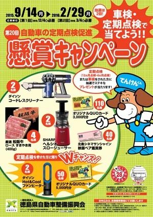【徳島】徳島県自動車整備振興会(藤村実会長)は14日から来年2月末までの約6カ月間、県内の会員工場で「第20回自動車点検整備促進 懸賞キャンペーン」を展開するは告知ポスター。期間中、県内で300を超える会員工場が参加し、ユーザー応募は2万...