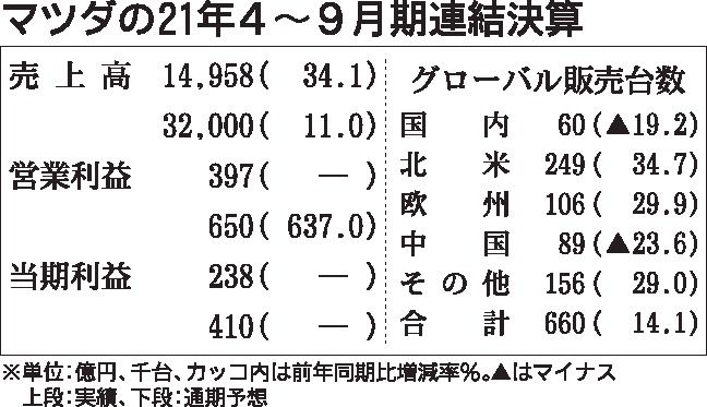 4~9月期は半導体供給不足に伴う生産調整の影響があったが、米国など販売好調な市場に優先供給し、リーンな在庫で効率的なオペレーションを実行した。グローバル販売台数は前年同期比14.1%増の66万台と伸長した。北米は同34.7%増、欧州も同29.9%増と好調に推移した。営業損益は397億円の黒字に転換した。前年同期は新型コロナウイルス感染拡大の影響から529億円の赤字だった。