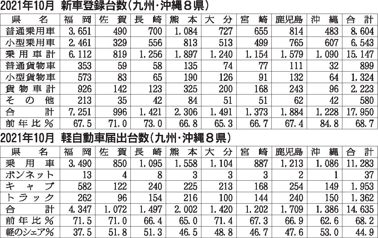 九州・沖縄地区の10月の新車販売台数(登録車+軽自動車)は、前年同期比31・5%減の3万2585台となり、4カ月連続で前年実績を下回った。登録車、軽自動車ともに同レベルの減少率だった。受注は依然、堅調に推移しているものの、部品不足による減...