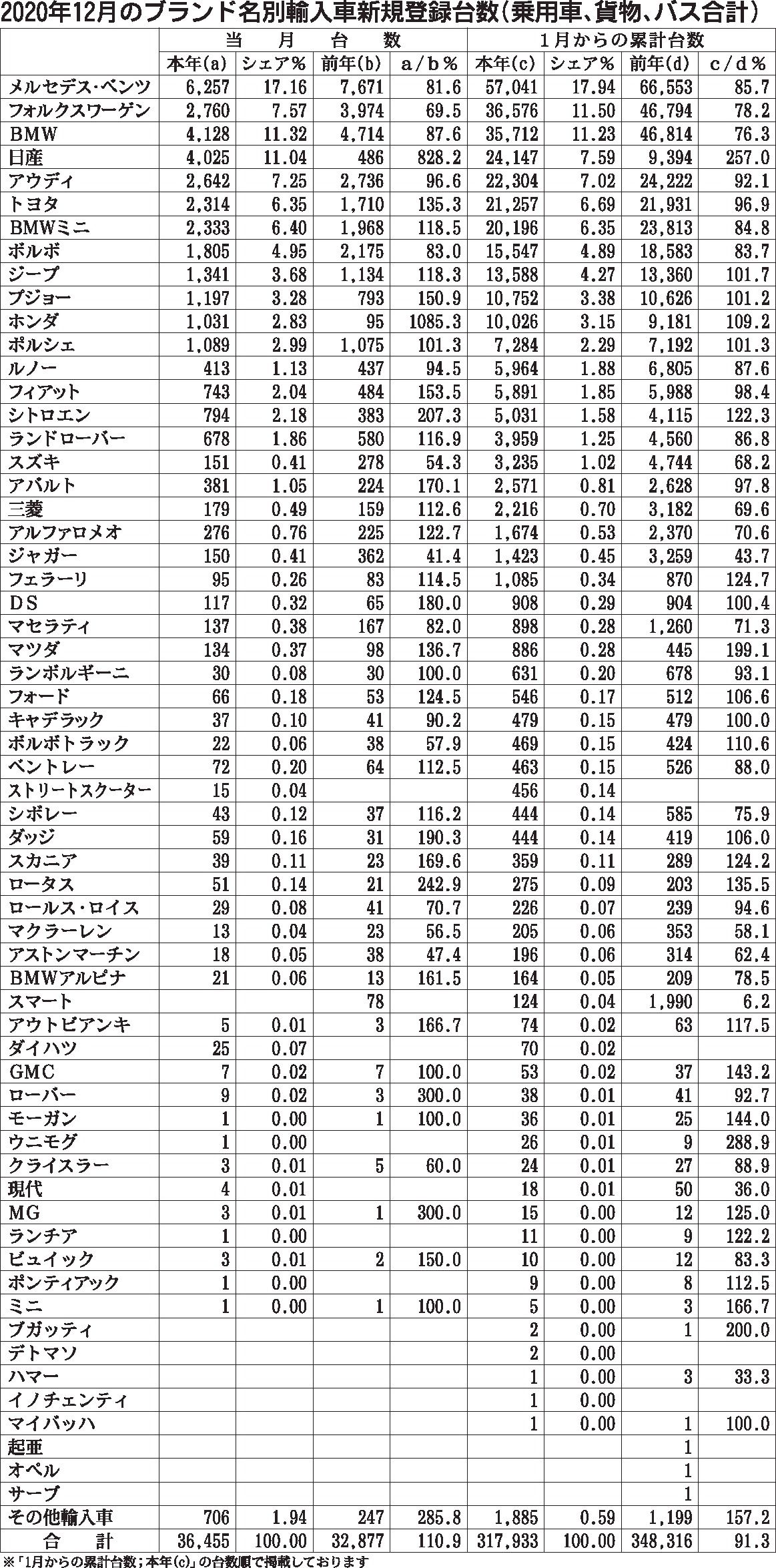〈2020年12月のブランド名別輸入車新規登録台数(乗用車、貨物、バス合計)〉
