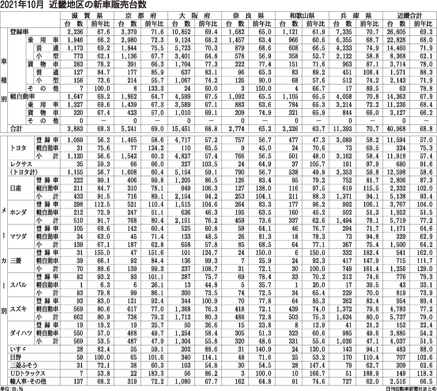 近畿2府4県の10月の新車販売台数(登録車+軽自動車)は、4カ月連続の前年割れとなる前年同月比31・2%減の4万968台だった。新車の供給遅れの影響が販売現場で色濃く表れ、2カ月連続で3割減を記録した。登録車は同30・8%減の2万6605...