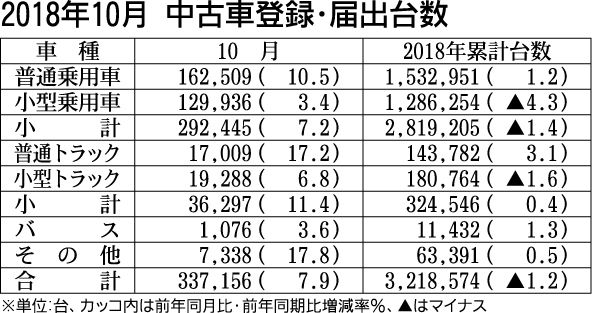日本自動車販売協会連合会(自販連)が12日に発表した10月の中古車登録台数(新規・移転・変更手続きの合算値)は、前年同月比7・9%増の33万7156台で2カ月ぶりに前年実績を上回った。地域別では、水害などで打撃を受けた大阪で同15・0%増...