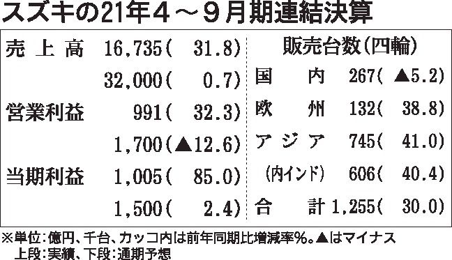 21年4~9月期の連結決算では、売上高が前年同期比31.8%増の1兆6735億円となり、3年ぶりにプラスに転じた。営業利益は、原材料価格高騰による475億円の押し下げがあったものの販売台数増や為替影響で同32.3%増の991億円となった。世界販売台数はインドなどの伸長で同30.0%増の125万5千台となった。下期以降も半導体不足や新型コロナウイルス感染拡大による部品調達難の影響が続く見通しで、今期の四輪車生産台数は期初計画より国内で27万8千台減、海外で36万3千台減の計64万1千台減る見通し。