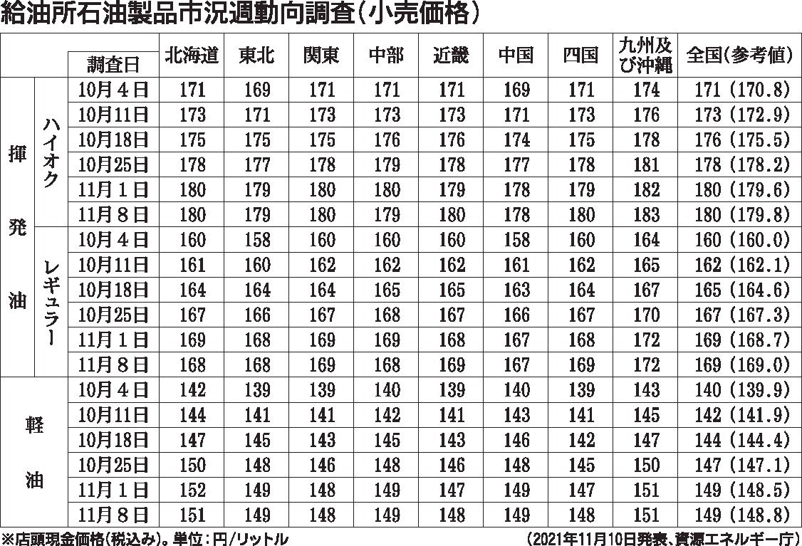 〈給油所石油製品市況週動向調査(小売価格)〉2021/10/4~11/8