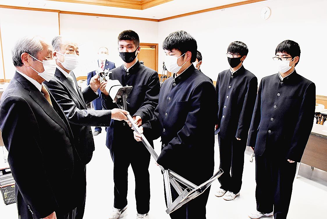 高校生がリサイクル部品活用し消毒用スタンド製作 山形自販リサイクルセンターに寄贈