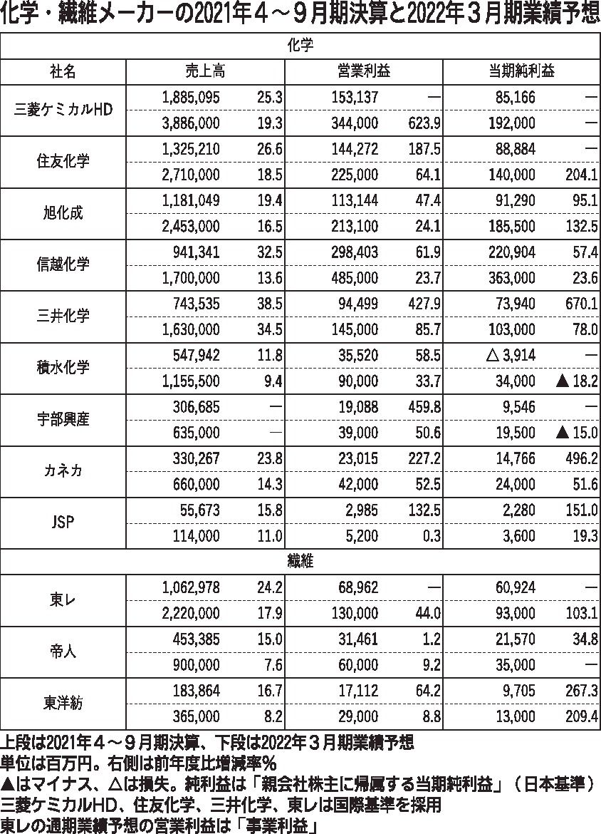 上場化学・繊維メーカー12社の2022年業績では、5社が通期業績予想を上方修正した。21年4~9月期は、前年同期が新型コロナウイルスの影響により不調だった自動車向け需要が右肩上がりで増加した。上期業績が好調だったことから三菱ケミカルホール...