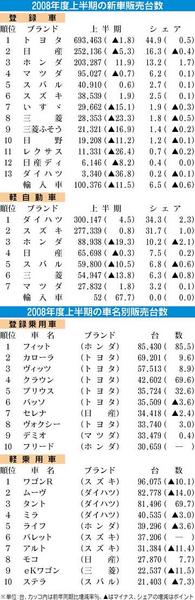 日本自動車販売協会連合会(自販連、天野洋一会長)が6日発表した2008年度上半期(4~9月)の車名別登録乗用車販売によると、昨年10月に発売したホンダ「フィット」が02年以来6年ぶり2度目の首位に立った。トヨタ自動車「カローラ」は6年ぶり...