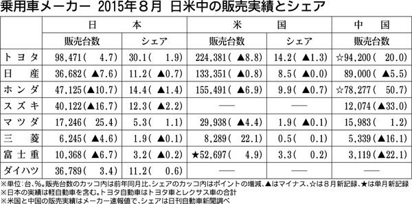 乗用車各社8月販売、富士重が米で単月新 中国はトヨタ、ホンダ好調