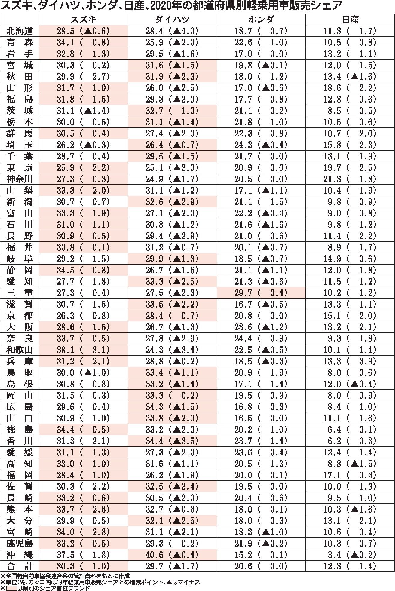 〈2020年の都道府県別軽乗用車販売〉スズキが26都道府県でトップシェア ダイハツは自然災害や火災も影響