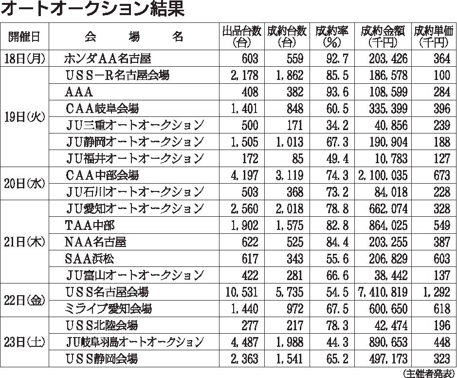 〈オートオークション結果〉中部地区 2021/1/18~23