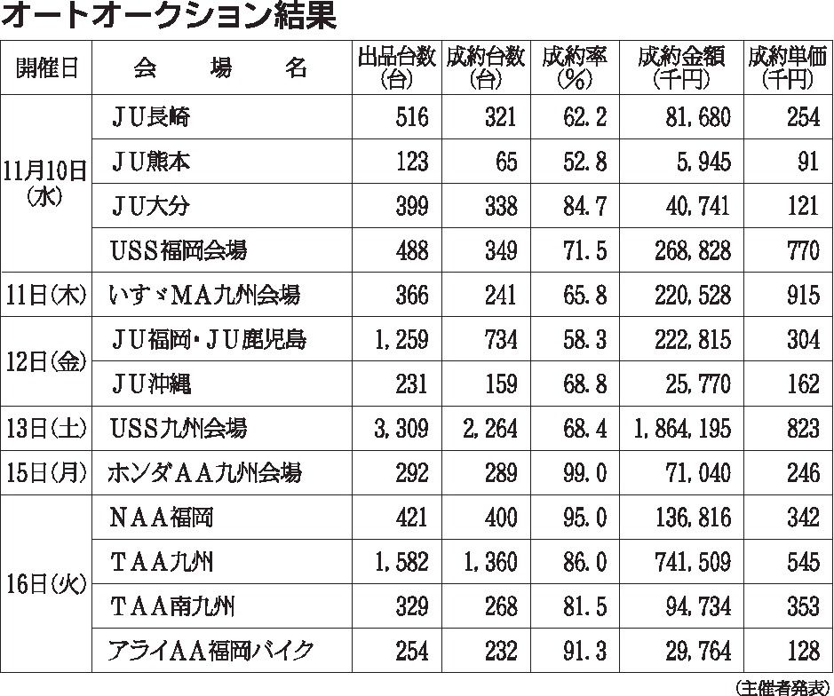 〈オートオークション結果〉九州地区 2021/11/10~16