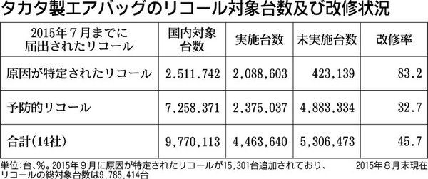 国土交通省は、タカタ製エアバッグのリコール(回収・無償修理)進ちょく状況を公表した。対象約977万台のうち、8月末時点で45・7%に当たる約446万4千台で改修を終えた。予防的なリコールを除くと改修率は83・2%になる。また、9月に約1万...