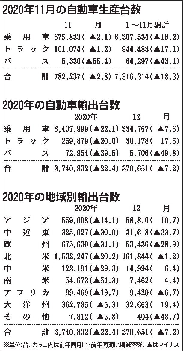 日本自動車工業会(自工会、豊田章男会長)がまとめた2020年の四輪車輸出台数は、前年比22・4%減の374万832台となり、6年ぶりにマイナスに転じた。新型コロナウイルスの世界的なまん延による自動車の需要減が響いた。地域ごとで回復度合いに...