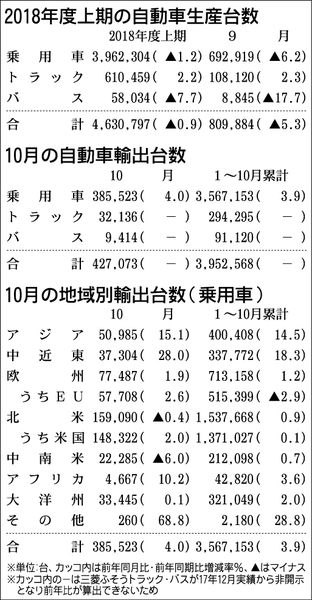 日本自動車工業会(豊田章男会長)が30日にまとめた2018年度上期(4~9月)の国内四輪車生産台数は、前年同期比0・9%減の463万797台で、2年ぶりの減少となった。軽乗用車が好調だったが、普通乗用車や小型乗用車が伸び悩んだ。 車種別で...
