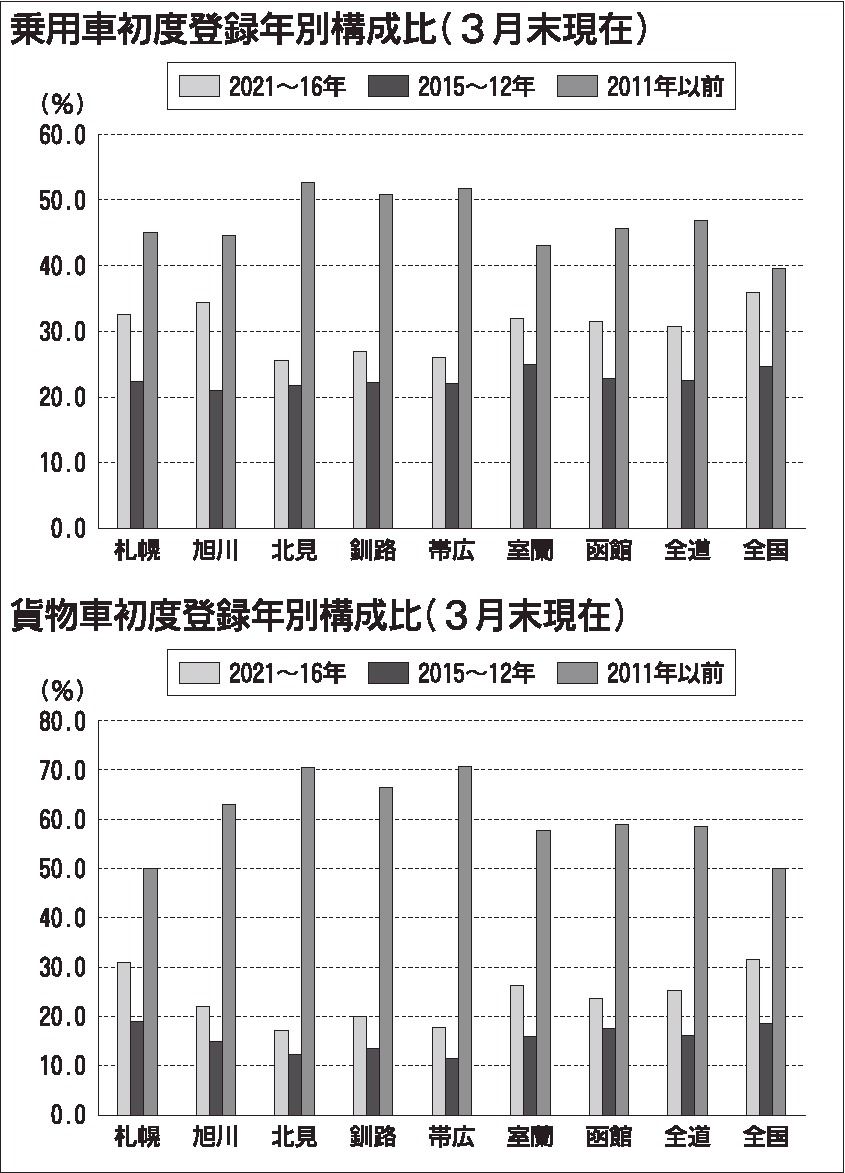 今年3月末時点で初度登録から10年以上(2011年以前)経過した北海道地区の長期使用車は、約126万8千台だった。その保有割合は前年より0・8㌽減の50・4%だった。5年続けて減少傾向を示したとはいえ、全国平均の42・5%と比べると道内の...