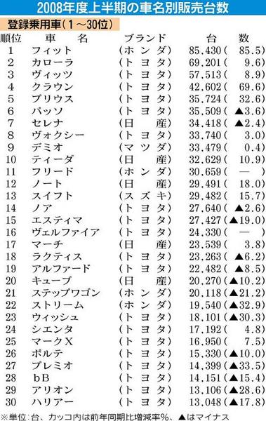 日本自動車販売協会連合会(自販連、天野洋一会長)は、6日にまとめた2008年度上半期(4~9月)の乗用車車名別順位に誤りがあったと発表した。日産自動車「ティーダ」(前年同期比10・9%増、3万2629台)が同日発表した上位銘柄30傑から漏...