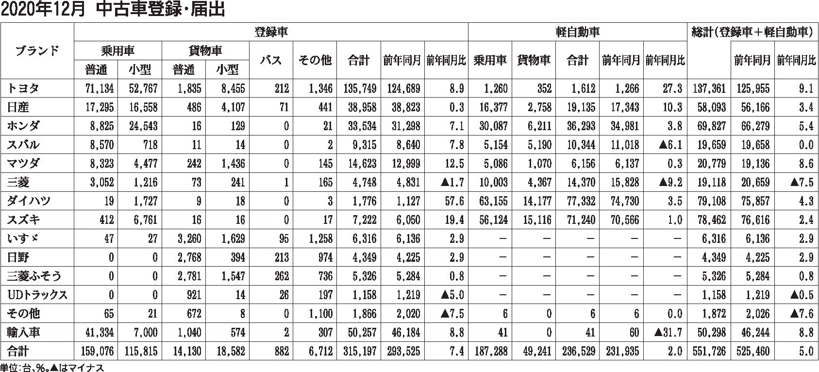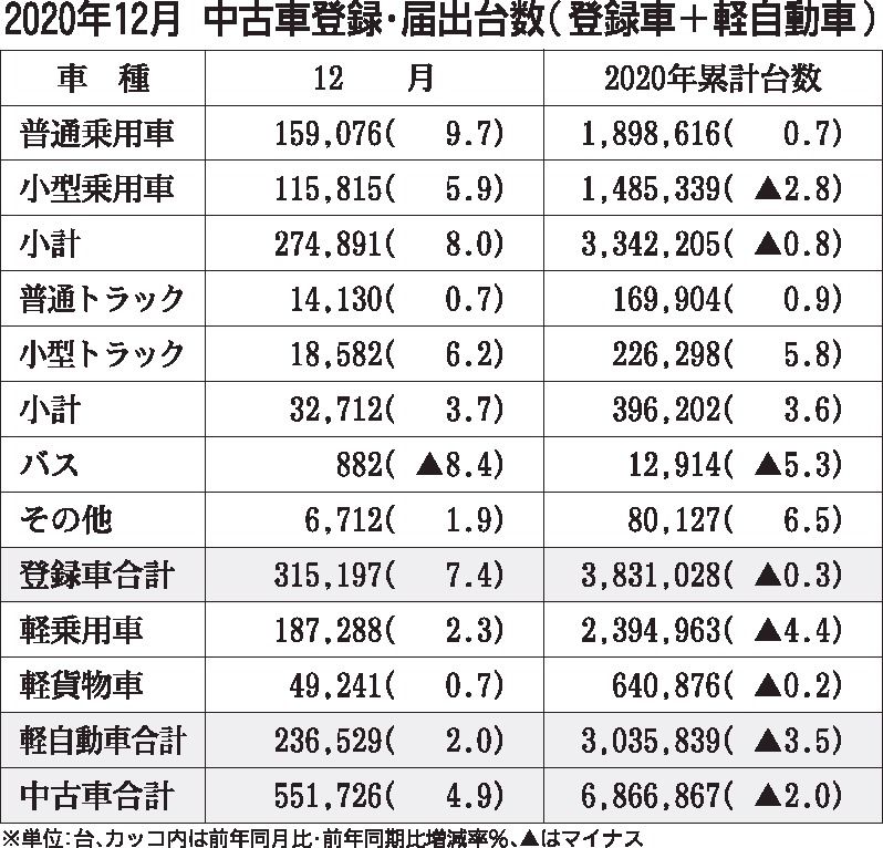 2020年(1~12月)の中古車登録・届け出台数は、前年比2・0%減の686万6867台と2年ぶりにマイナスに転じた。コロナ禍の影響を受けたが、新車納期の遅れや通勤などでの感染予防のために中古車需要が高まったことでほぼ前年並みを維持した。...
