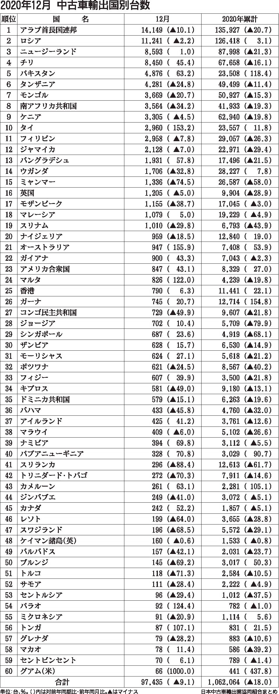日本中古車輸出業協同組合(佐藤博理事長)がまとめた2020年(1~12月)の中古車輸出台数は、前年比18・0%減の106万2064台と2年連続で前年を下回った。コロナ禍で海外の仕向け地がロックダウン(都市封鎖)や通関停止に踏み切ったことな...