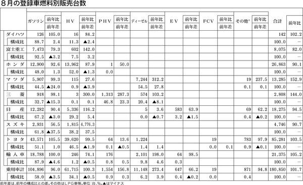 日本自動車販売協会連合会(自販連)がまとめた8月の乗用車燃料別販売台数によると、ディーゼルエンジン(DE)車とプラグインハイブリッド車(PHV)が前年同月実績を大幅に上回った。DE車の販売台数は約3倍の1万1148台で、全体に占める構成比...