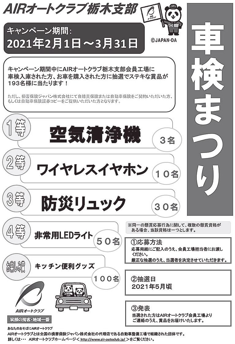 【宇都宮】損害保険ジャパンのモーター代理店で組織するAIRオートクラブ栃木支部(原安礼支部長)は、3月までの2カ月間に恒例の「車検まつり」を実施する。同支部に所属する80の会員工場への入庫促進やAIRオートクラブの知名度向上を目指すととも...