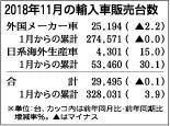 日本自動車輸入組合(JAIA)が6日発表した11月の外国メーカー車の新規登録台数は前年同月比2・2%減の2万5194台だった。2カ月ぶりのマイナスだったが、11月単月としては1988年の統計開始以来、過去3番目の高水準。1月からの累計は昨...