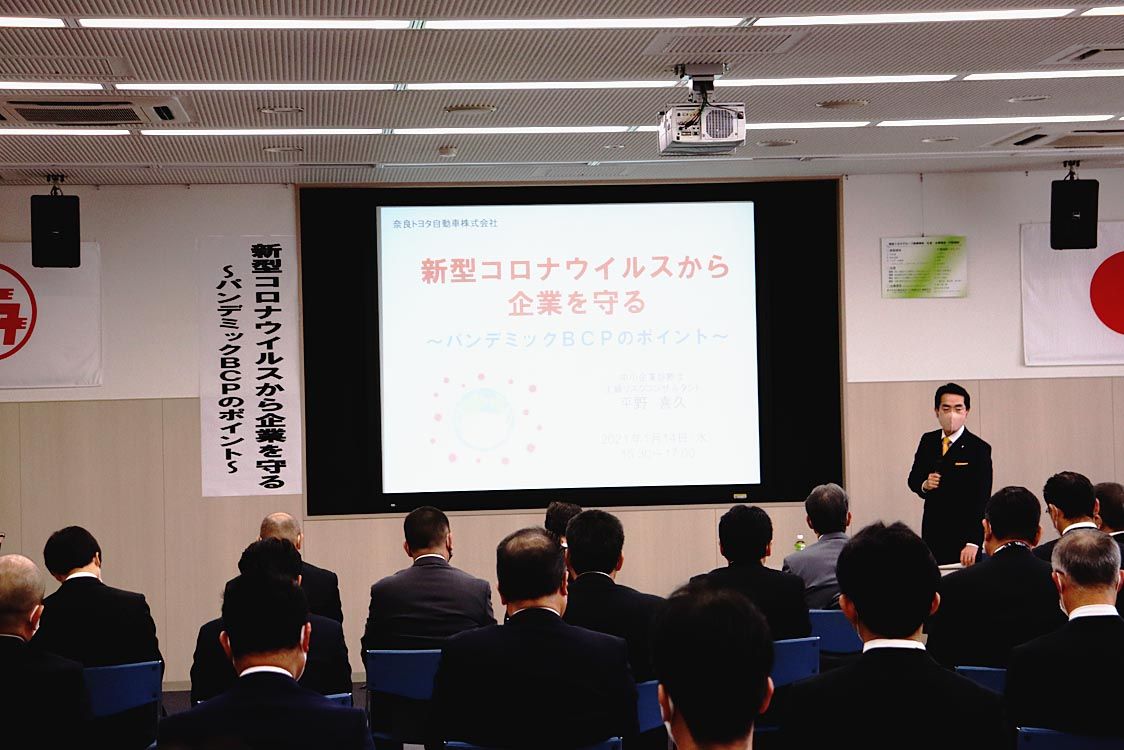 【奈良】奈良トヨタ(菊池攻社長)グループは、奈良本社(奈良市)で管理職研修会「新型コロナウイルスから企業を守る」を開いた=写真。県内でも新型コロナウイルス感染症が再拡大していることから、事業継続計画(BCP)の策定支援をテーマに講演を実施...