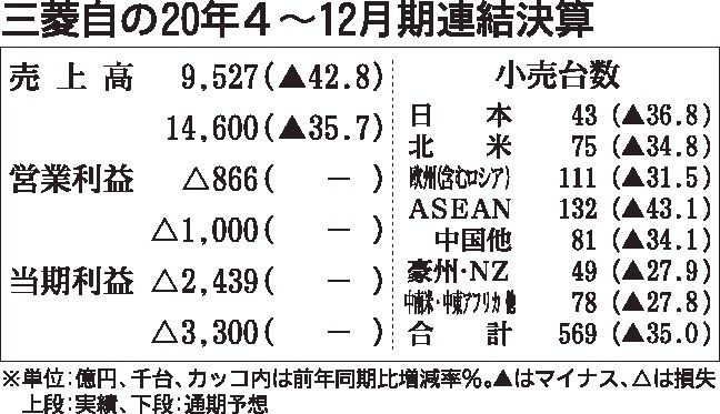 三菱自動車が2日に発表した2020年4~12月期の連結決算は、売上高が前年同期比42.8%減の9527億円、営業損失は866億円の赤字だった。新型コロナウイルスの感染拡大や半導体不足の影響が顕在化する中で通期見通しは前回発表から販売台数を2万2000台減の80万2000台とし、売上高を200億円減の1兆4600億円と下方修正した。一方で、構造改革の効果で営業損失を400億円改善の1000億円の赤字、当期純損失は300億円改善の3300億円の赤字とした。