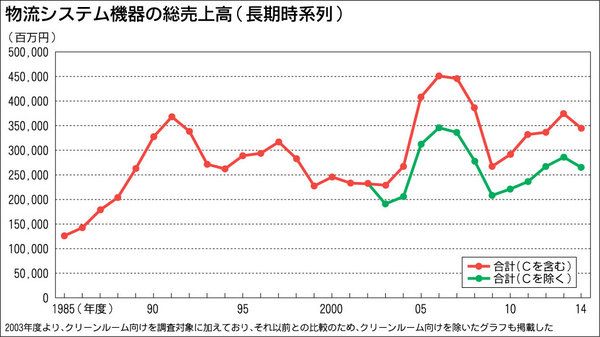 14年度物流システム機器生産出荷統計 総売り上げ金額、件数ともに減少