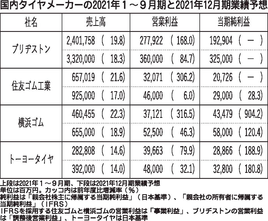 国内タイヤメーカー4社の2021年12月期業績見通しが、原材料価格や海上運賃の高騰により圧迫されている。21年1~9月期では各社とも補修用タイヤを中心に販売を伸ばしており「モノは売れている状態」(トーヨータイヤ)だが、外的要因による影響を...