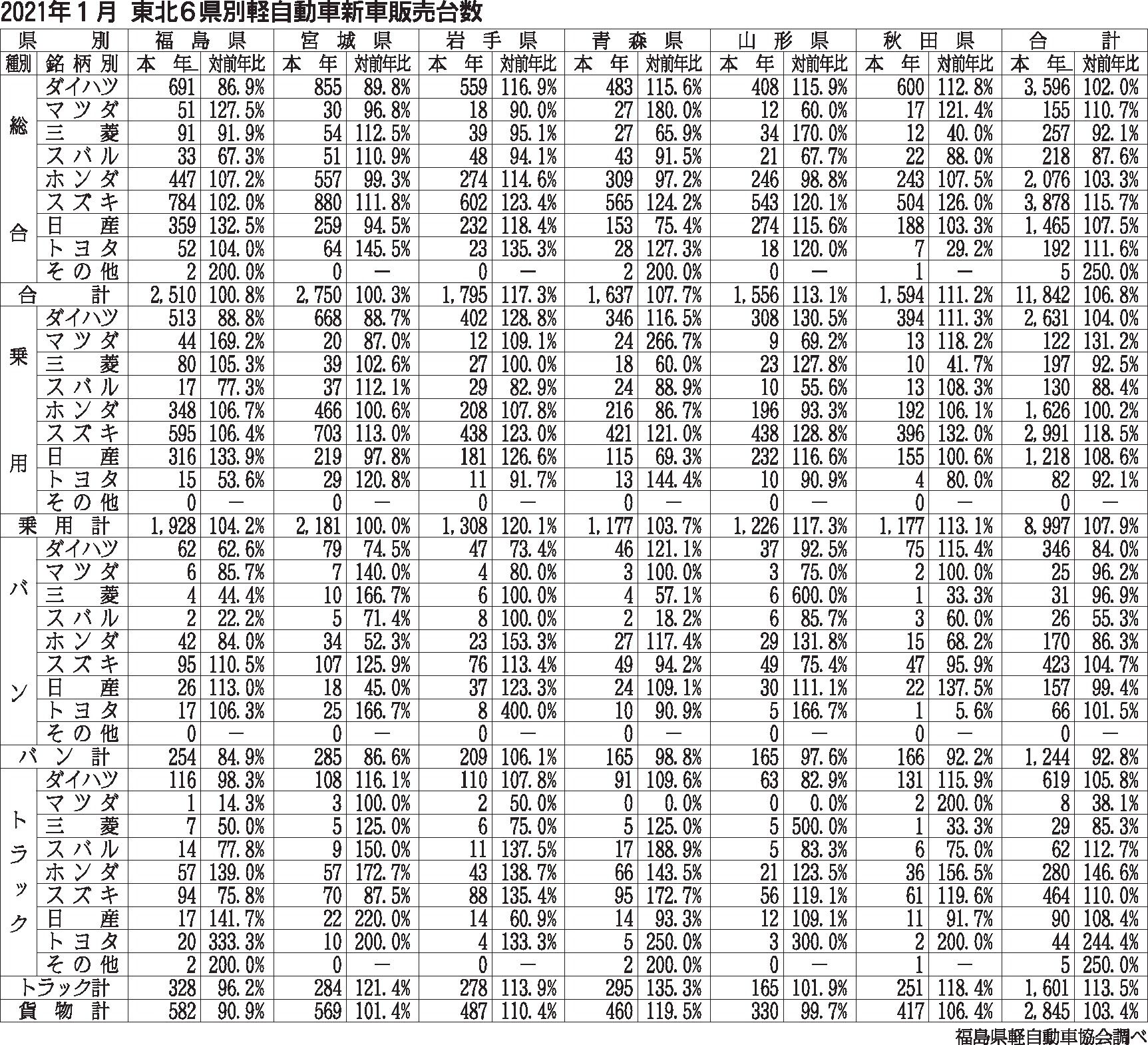 〈2021年1月 東北6県別軽自動車新車販売台数〉
