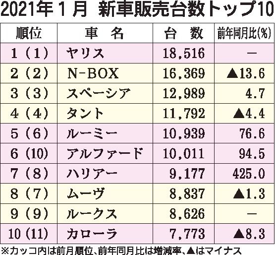 上位10車種のうちトヨタ車以外は、2020年12月に全面改良した日産自動車「ノート」が6位にランクアップ。ホンダ「フィット」は5889台で10位だった。