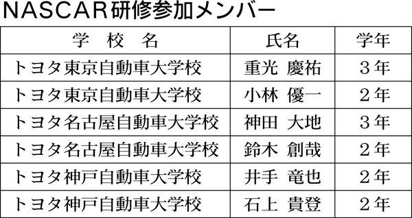 トヨタ自動車大学校の合同チームが、7月31日に米アイオワ州で開催された「NASCAR K&N プロシリーズイースト第9戦」でピットクルーに挑戦し、東西混合戦で2位(イーストシリーズで1位)を獲得する快挙を成し遂げた(既報)。学生6人が参戦...