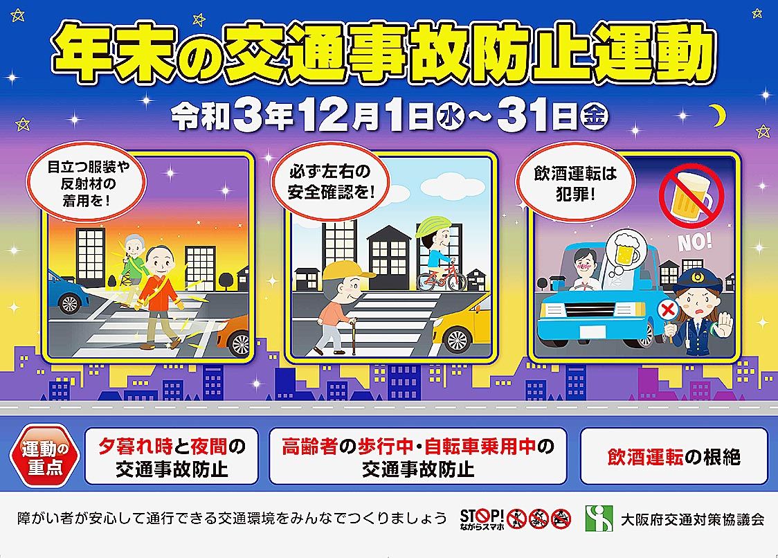 【大阪】大阪府内で1日から「令和3年年末の交通事故防止運動」がスタートした。例年、年末にかけて交通事故が多発する傾向にあり、大阪府警察本部などは31日まで交通安全意識の啓発活動を一層強化し、交通事故の撲滅を目指す構えだ。 交通量の増加や飲...