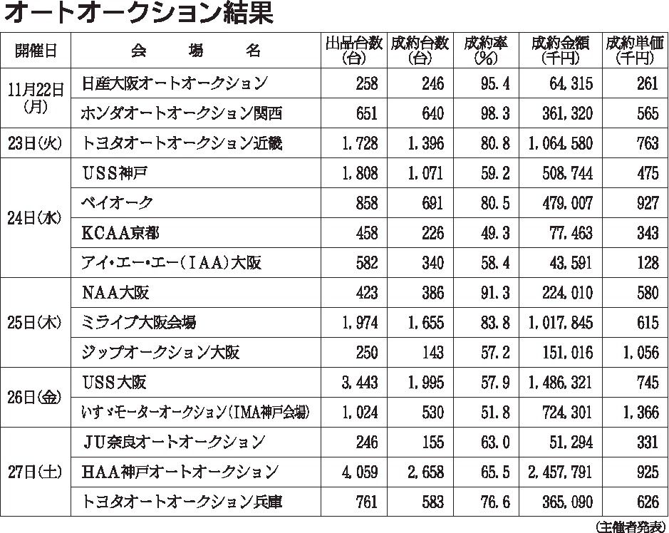 〈オートオークション結果〉近畿地区 2021/11/22~27