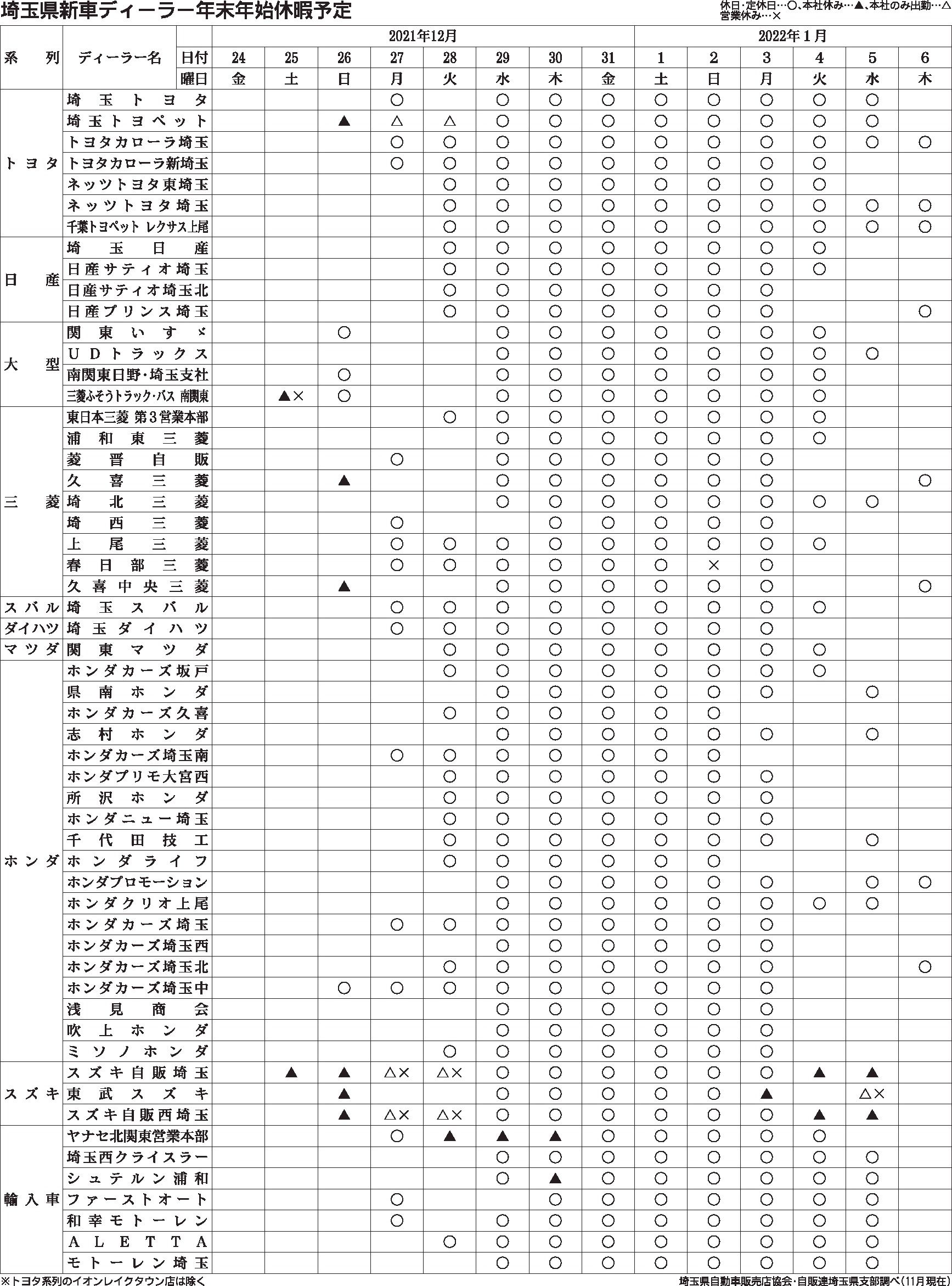 〈埼玉県新車ディーラー年末年始休暇予定〉2021/12/24~2022/1/6