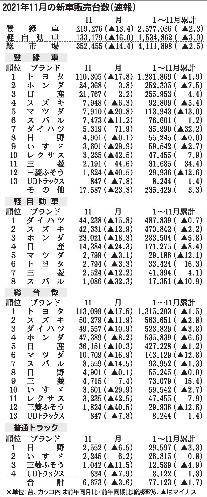 2021年11月の国内新車販売、14.4%減で5カ月連続の減少 新車の供給量回復でマイナス幅は大幅縮小