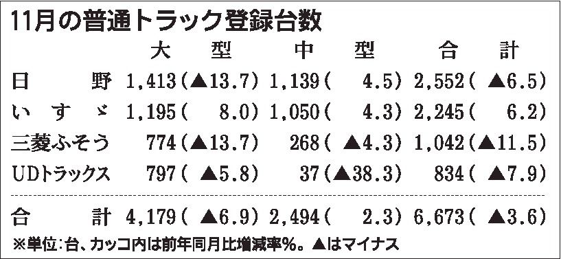 業界筋によると、11月の普通トラック(積載量4㌧以上)販売台数は前年同月比3・6%減の6673台だった。2カ月ぶりの減少で、いすゞ自動車を除く3社が減少した。 メーカー別ではいすゞが同6・2%増の2245台でシェアは同3・1㌽増の33・6...
