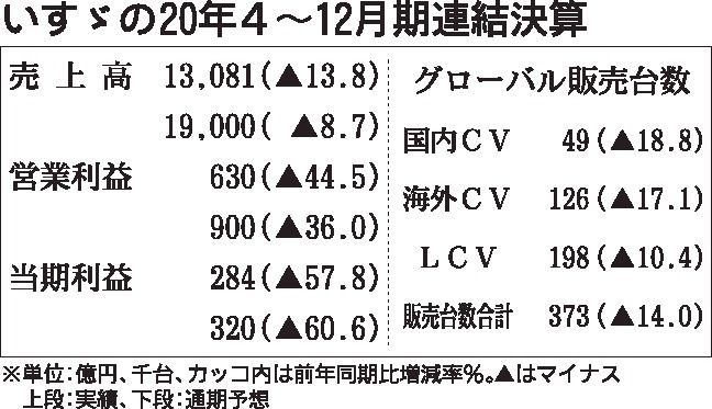 20年4~12月期連結決算は、売上高が前年同期比13.8%減、営業利益が同44.5%減、当期純利益が同57.8%減と2期連続の減収減益となった。四半期ベースでは、10~12月期はLCVの台数増に加え、原価低減活動など費用圧縮の推進により収益を確保した。「タイLCVは新型ピックアップの好調が続き海外CVは中国で増加した」(中俣直人執行役員)。