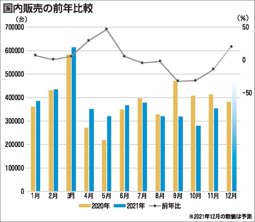 2021年の国内新車販売、前年割れ濃厚に 12月が2割増でも届かず 部品供給難による下期の減産響く
